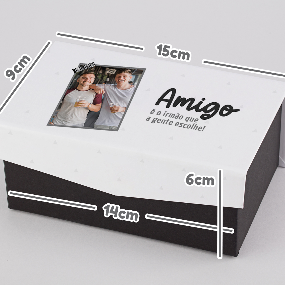 ✅ Caixa cartonada com base medindo 14x9x6cm e tampa personalizada medindo 15x9x3cm aproximadamente;