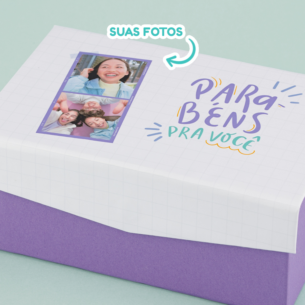 Você pode personalizar a capa da caixa com nome e fotos se houver, depende de cada modelo. E pode personalizar os cubos com fotos.