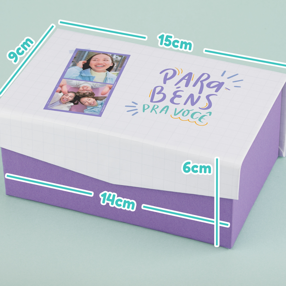 ✅ Caixa cartonada com base medindo 14x9x6cm e tampa personalizada medindo 15x9x3cm aproximadamente;