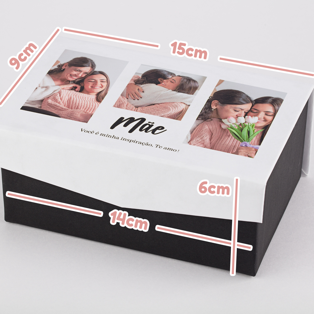 ✅ Caixa cartonada com base medindo 14x9x6cm e tampa personalizada medindo 15x9x3cm aproximadamente;