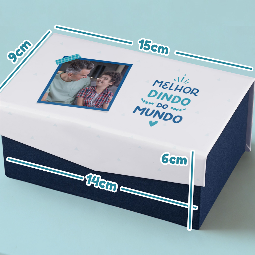 ✅ Caixa cartonada com base medindo 14x9x6cm e tampa personalizada medindo 15x9x3cm aproximadamente;