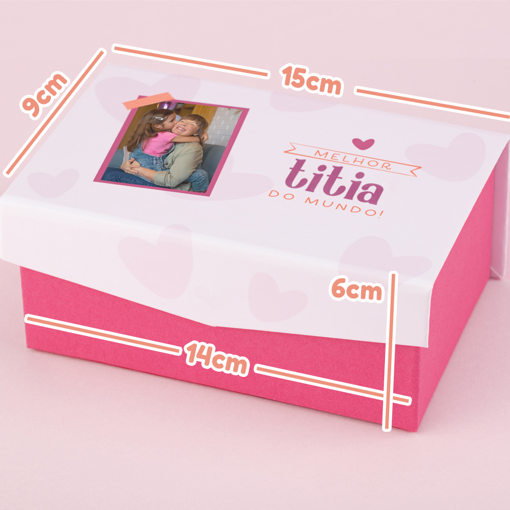 ✅ Caixa cartonada com base medindo 14x9x6cm e tampa personalizada medindo 15x9x3cm aproximadamente;