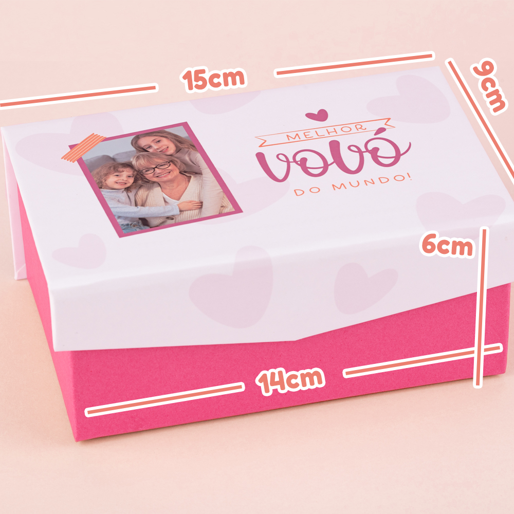 ✅ Caixa cartonada com base medindo 14x9x6cm e tampa personalizada medindo 15x9x3cm aproximadamente;