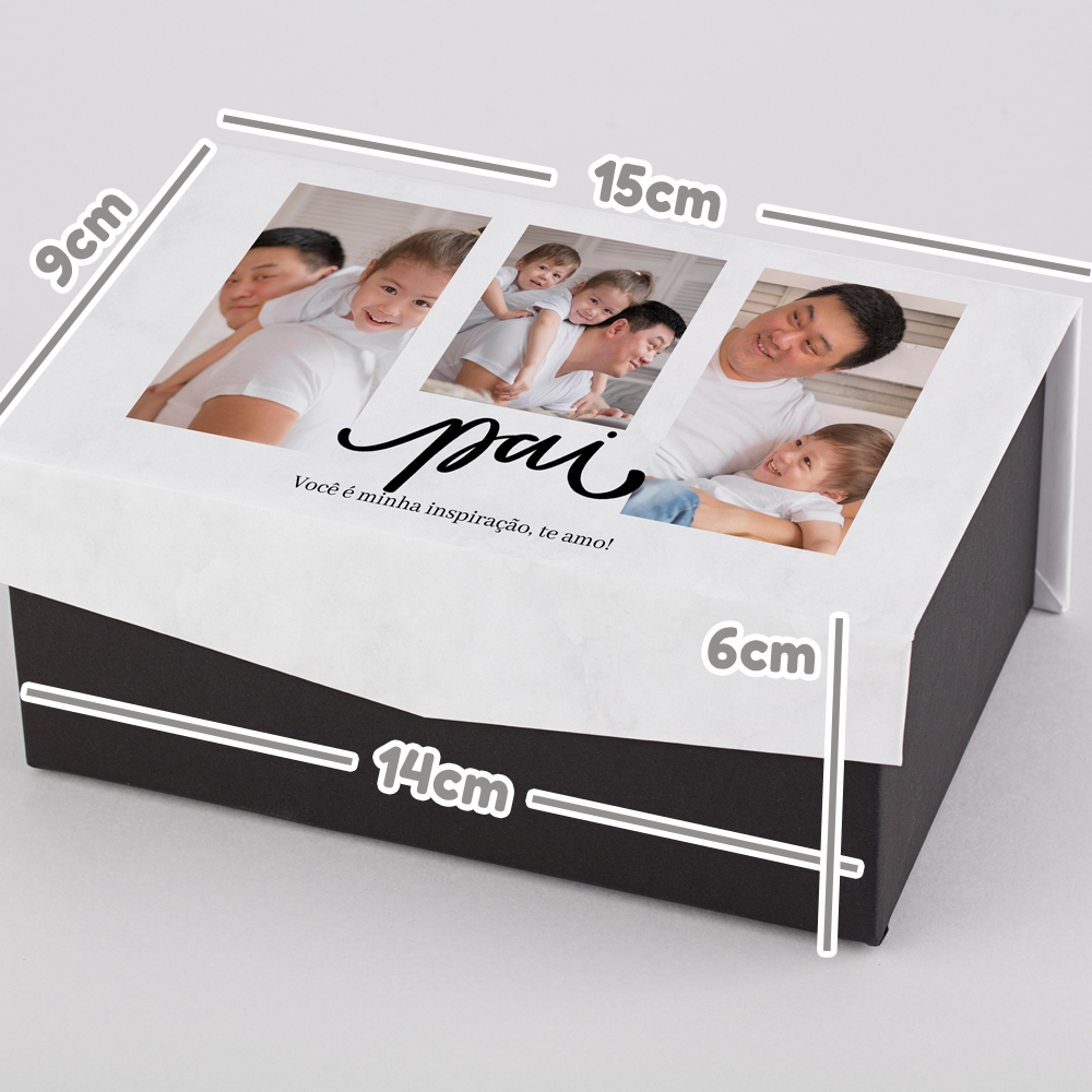 ✅ Caixa cartonada com base medindo 14x9x6cm e tampa personalizada medindo 15x9x3cm aproximadamente;