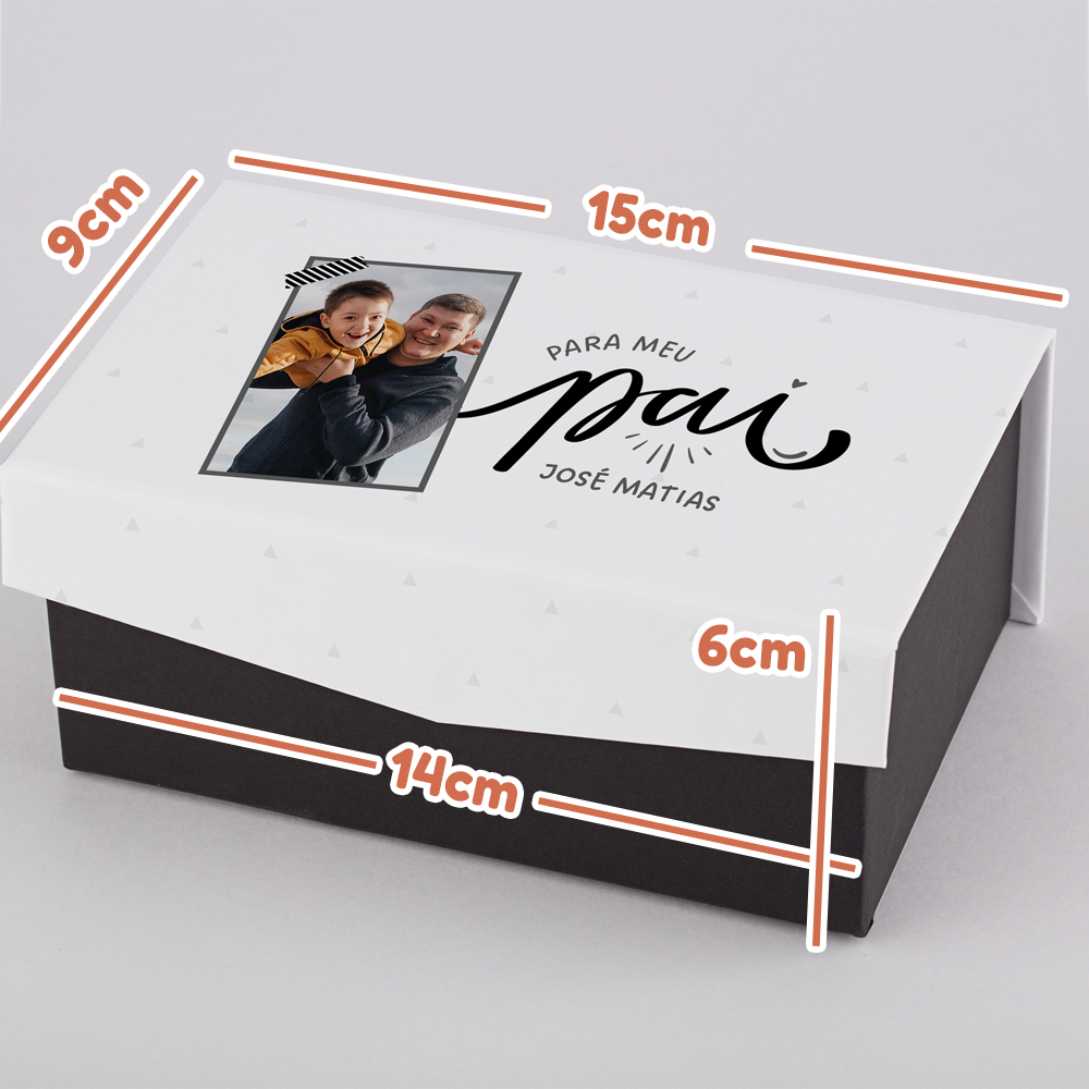 ✅ Caixa cartonada com base medindo 14x9x6cm e tampa personalizada medindo 15x9x3cm aproximadamente;