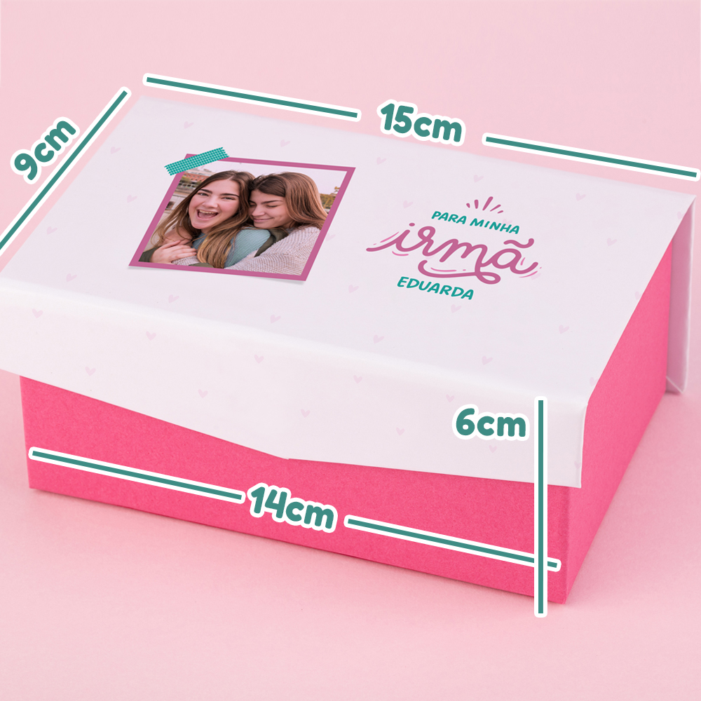 ✅ Caixa cartonada com base medindo 14x9x6cm e tampa personalizada medindo 15x9x3cm aproximadamente;