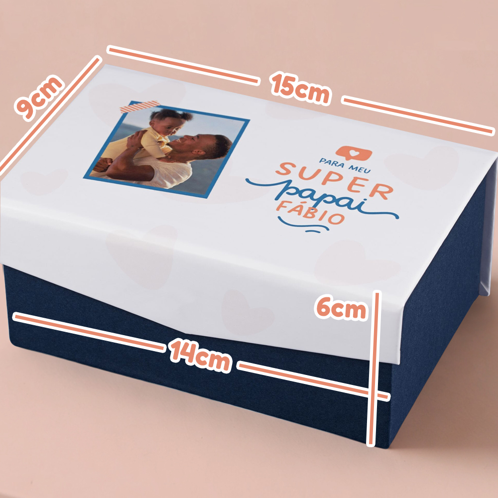 ✅ Caixa cartonada com base medindo 14x9x6cm e tampa personalizada medindo 15x9x3cm aproximadamente;