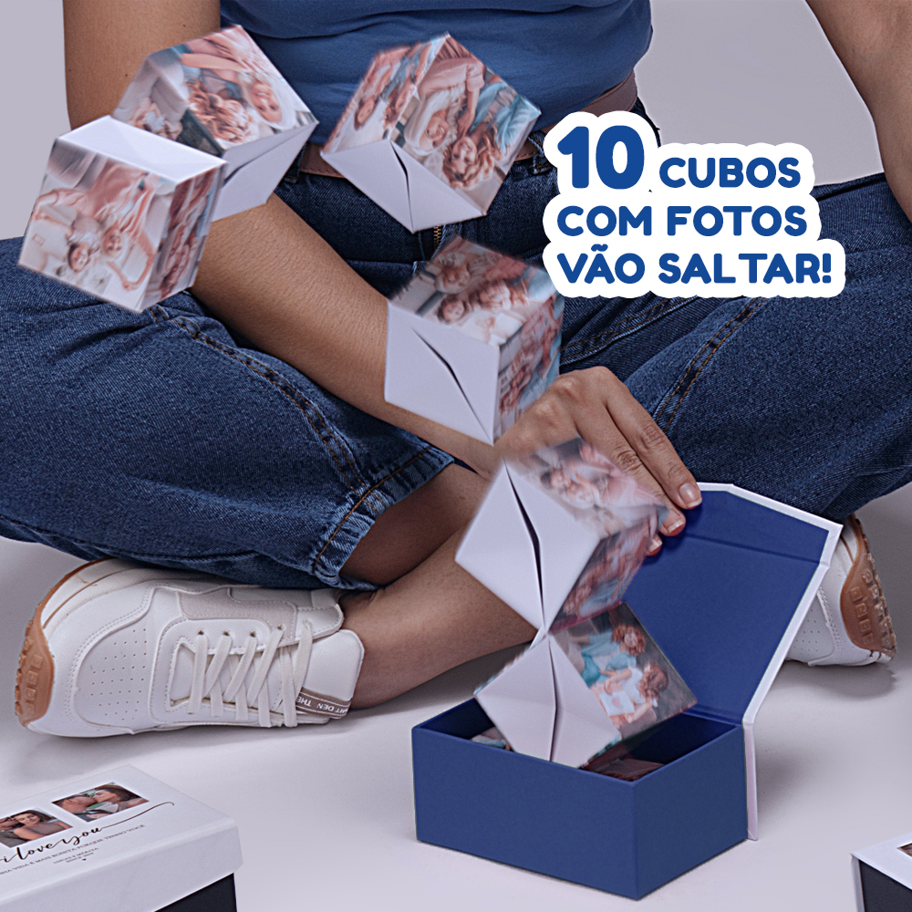 Nossa caixa surpresa com cubos que saltam personalizada é a escolha ideal para quem quer surpreender em datas especiais. Ao abrir a caixa, 10 cubos com fotos vão saltar, criando um momento inesquecível para quem recebe. No fundo da caixa um cartão com uma mensagem escolhida pelo cliente. Uma forma muito fofa e divertida de dizer eu te amo ❤️.