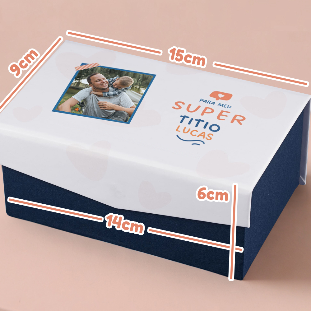 ✅ Caixa cartonada com base medindo 14x9x6cm e tampa personalizada medindo 15x9x3cm aproximadamente;